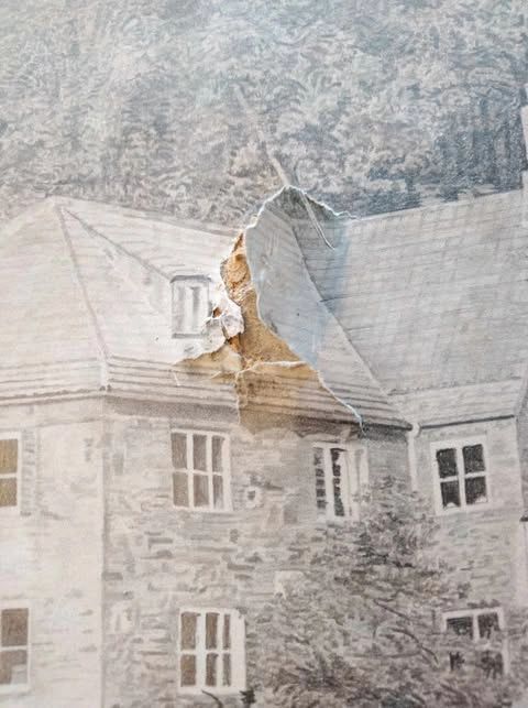 A pencil drawing badly damaged with tear and partial missing paper.